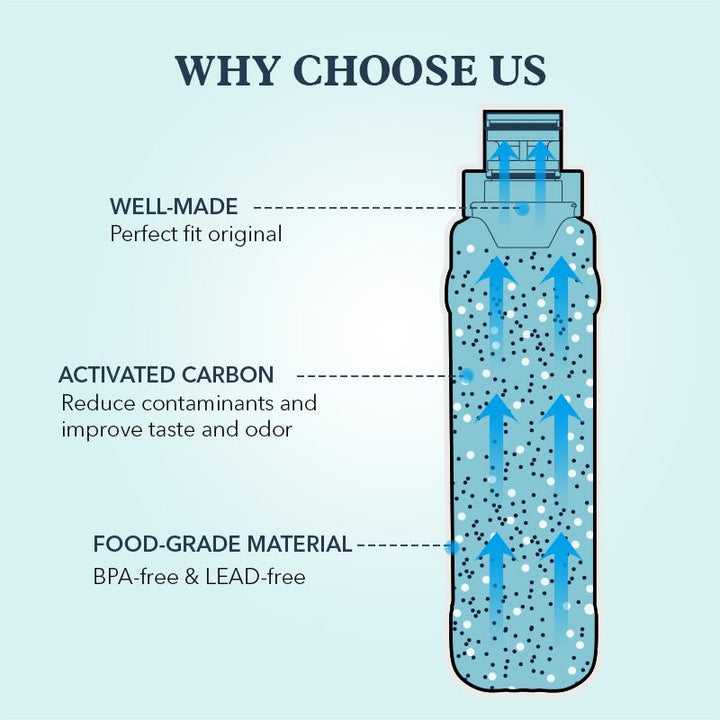 BPA-Free and food-grade materials, Sri Lankan coconut shell carbon block, super adsorption capacity, maximum reduction of harmful impurities contained in drinking water. Compatible with the following models: EDR2RXD1, W10413645A, 9082, Filter 2, 46-9903, P6RFWB2, P9WB2L, W10413645, W1023815A.